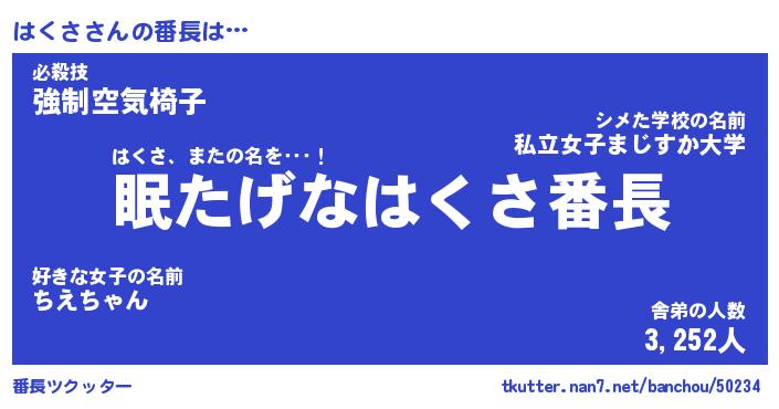 | ヒーロー風カッコイイあだ名 | 『スーパーハクサ』『ウルトラはくさマン』 |