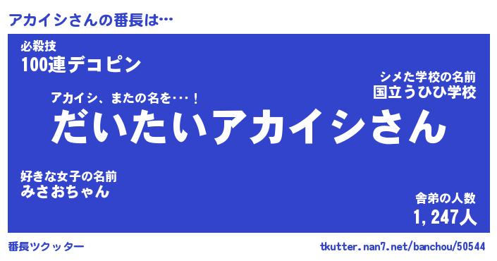 | 意味不明あだ名 | 『ペロリンアカイシ』『永久保存アカイシ』 |