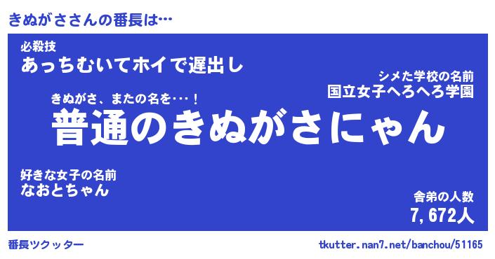 | 意味不明あだ名 | 『ペロリンきぬがさ』『永久保存きぬがさ』 |