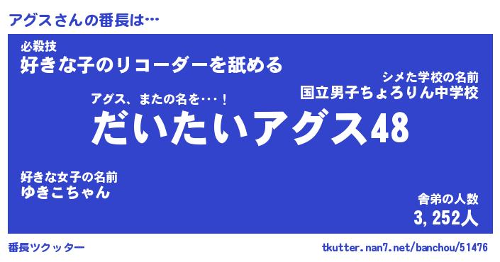 | 意味不明あだ名 | 『ペロリンアグス』『アグスフォーエバー』 |