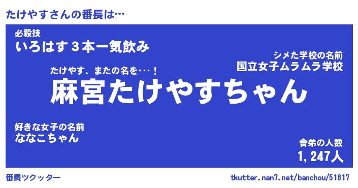| ヘコむあだ名 | 『たけっふぃ~』『なまこ酢』 |