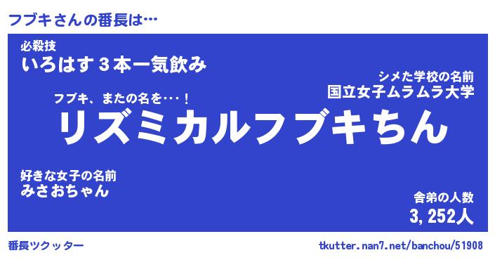 | ヒーロー風カッコイイあだ名 | 『スーパーフブキ』『ウルトラフブキマン』 |