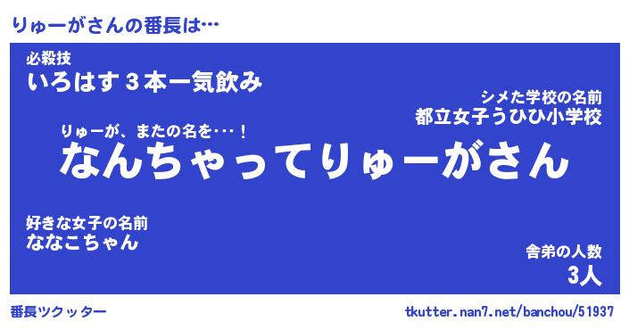 | 肩書あだ名 | 『りゅーが御曹司』『りゅーが国家主席』 |