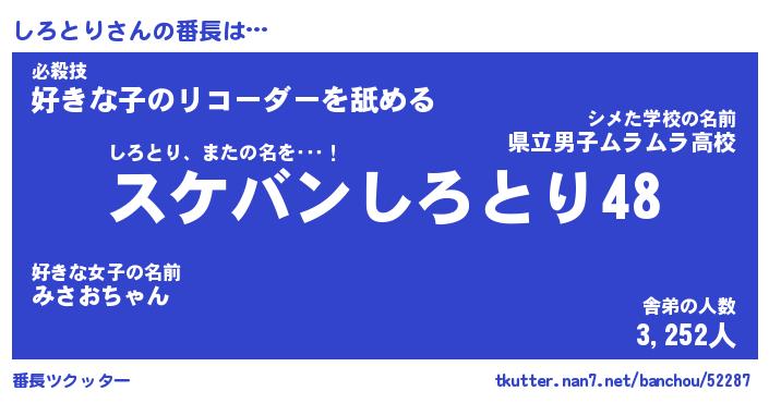 | 意味不明あだ名 | 『ペロリンしろとり』『永久保存しろとり』 |