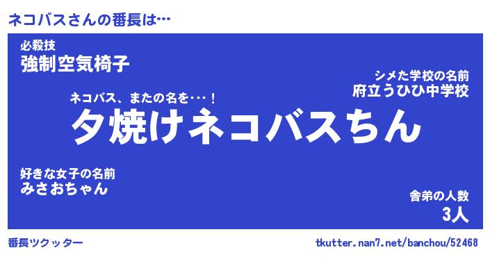 | 意味不明あだ名 | 『ペロリンネコバス』『永久保存ネコバス』 |