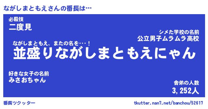 | 伝説のあだ名 | 『不死鳥のスナイパーながしまともえ』 |