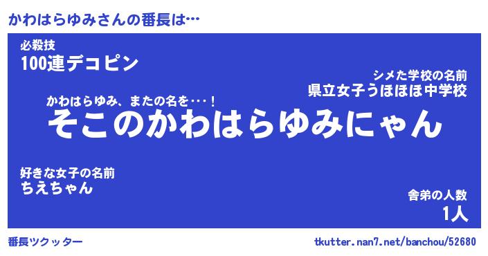 | 胡散臭い通販商品みたいなあだ名 | 『モテモテ間違いなし霊験あらたかなお札…その名も「かわはらゆみ」』 |