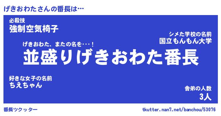 | 肩書あだ名 | 『げきおわた御曹司』『げきおわた班長』 |