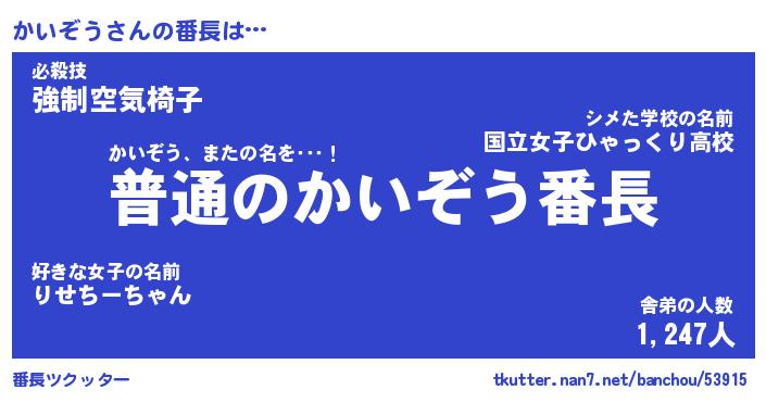 | 肩書あだ名 | 『かいぞう御曹司』『かいぞう国家主席』 |