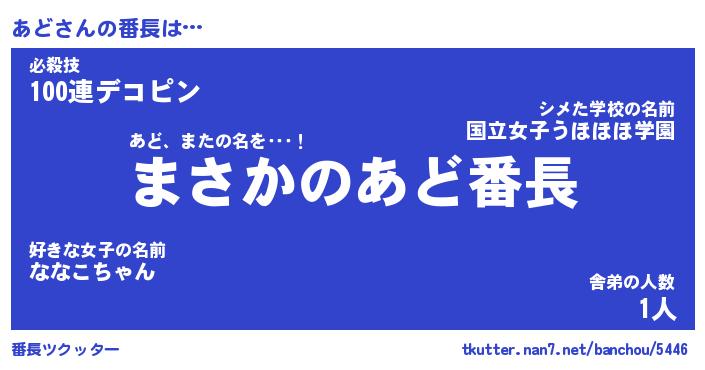 | 肩書あだ名 | 『あど社長』『あど総理大臣』 |