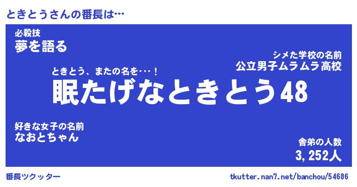 | 意味不明あだ名 | 『ペロリンときとう』『永久保存ときとう』 |