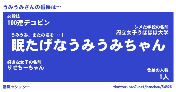 | 肩書あだ名 | 『うみうみ社長』『うみうみ総理大臣』 |