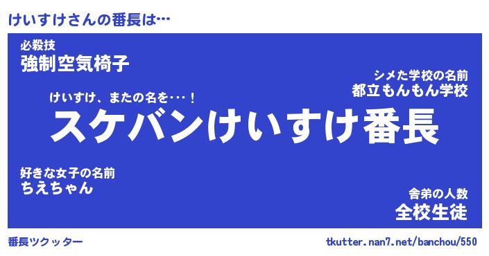 | ヒーロー風カッコイイあだ名 | 『スーパーケイスケ』『暗黒騎士ケイ』 |
