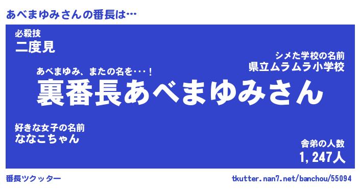 | 肩書あだ名 | 『あべまゆみ店長』『あべまゆみ総理大臣』 |