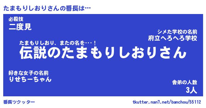 | 男性向けラノベタイトル風あだ名 | 『たまもりしおりの憂鬱』 |