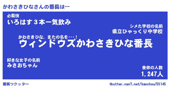 | ヒーロー風カッコイイあだ名 | 『スーパーカワサキヒナ』『銀牙騎士カワ』 |