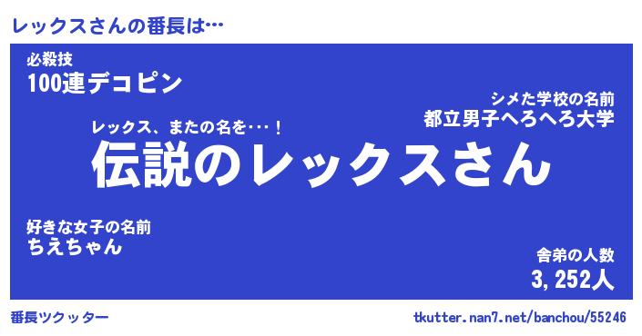 | 意味不明あだ名 | 『ペロリンレックス』『永久保存レックス』 |