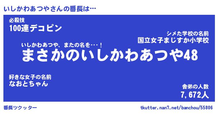 | 恥ずかしいあだ名 | 『プリティーいしかわあつや』『いしちん』 |