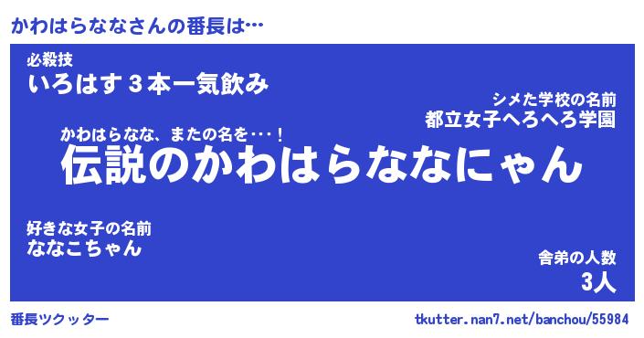 | 肩書あだ名 | 『かわはらなな社長』『かわはらなな班長』 |
