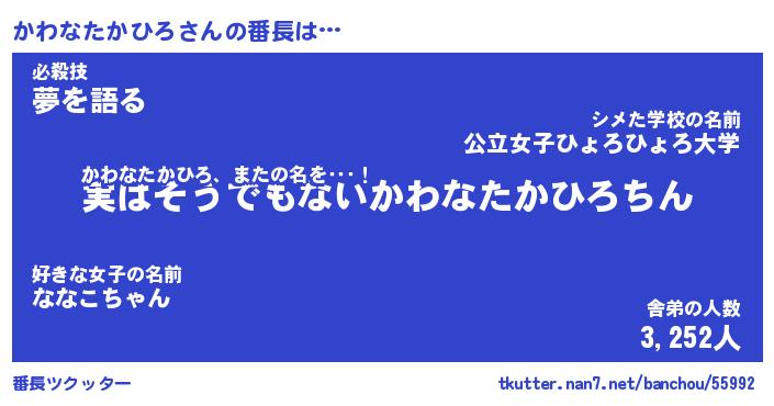 | ヒーロー風カッコイイあだ名 | 『スーパーカワナタカヒロ』 |