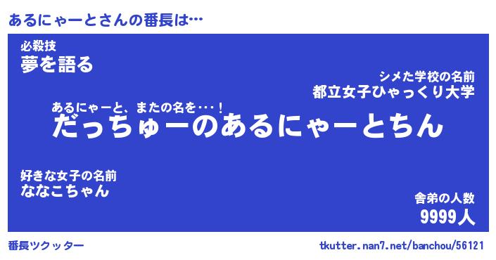 | 伝説のあだ名 | 『伝説のスナイパーあるにゃーと』 |