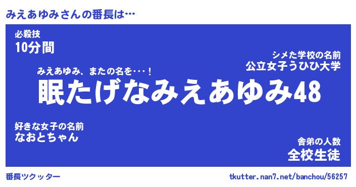 | 伝説のあだ名 | 『封印されしスナイパーみえあゆみ』 |