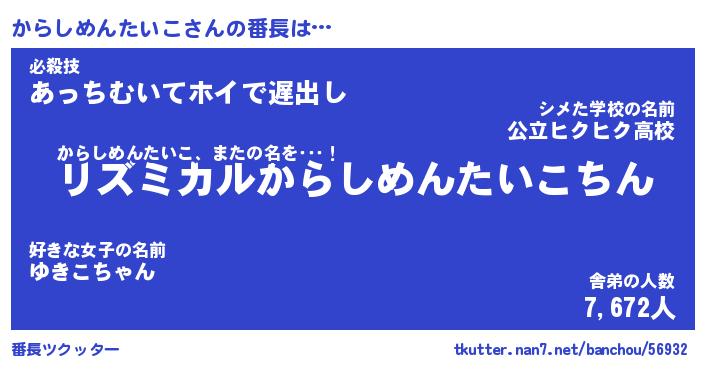 | 男性向けラノベタイトル風あだ名 | 『からしめんたいこの憂鬱』 |