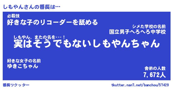 | 意味不明あだ名 | 『ペロリンしもやん』『永久保存しもやん』 |