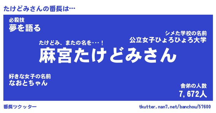 | ヘコむあだ名 | 『たけもー』『豆乳』『たけ太郎』 |