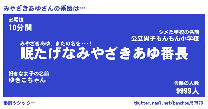 | 肩書あだ名 | 『みやざきあゆCEO』『みやざきあゆ班長』 |