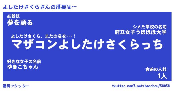 | 伝説のあだ名 | 『封印されしスナイパーよしたけさくら』 |