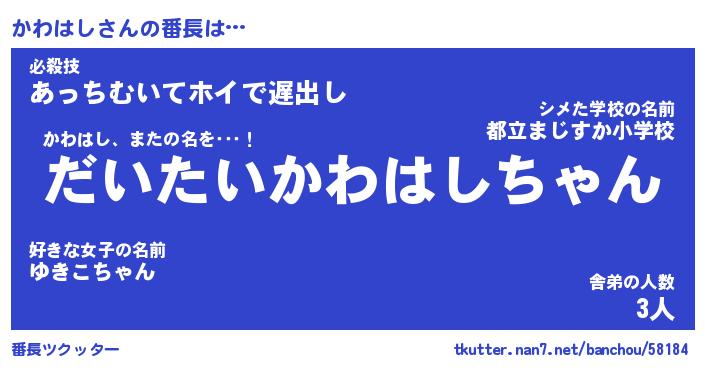 | 意味不明あだ名 | 『ペロリンかわはし』『永久保存かわはし』 |