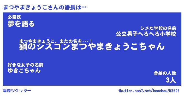 | 男性向けラノベタイトル風あだ名 | 『マツヤマキョウコアートオンライン』 |