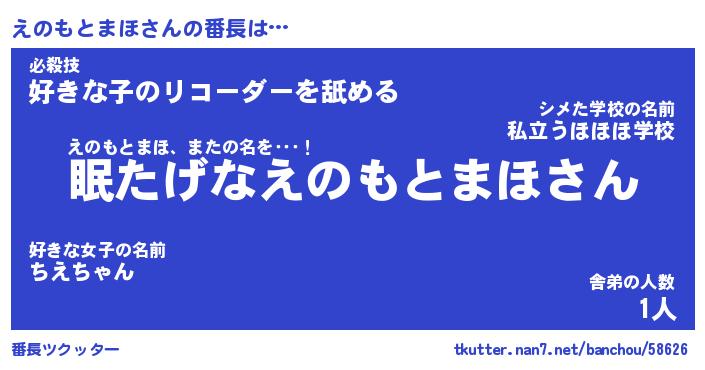 | 伝説のあだ名 | 『封印されしスナイパーえのもとまほ』 |