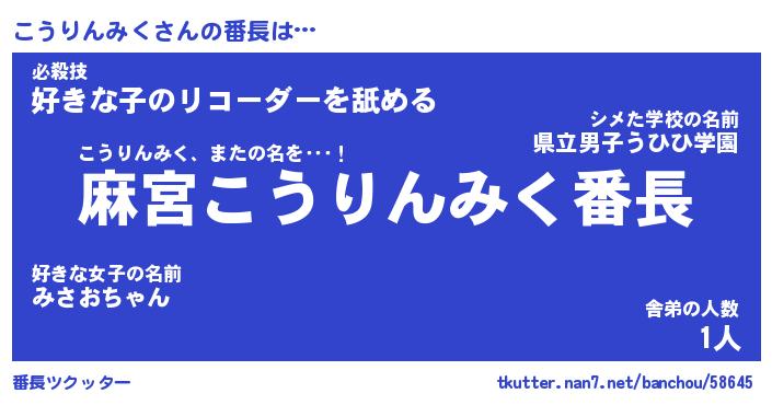 | 伝説のあだ名 | 『不死鳥のスナイパーこうりんみく』 |