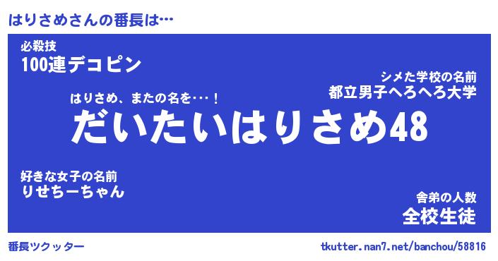 | ピコ太郎風あだ名 | 『ハコ二郎』『ピハ一郎』『ハリ次郎』 |