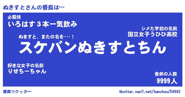| ヒーロー風カッコイイあだ名 | 『スーパーヌキスト』『天弓騎士ヌキ』 |