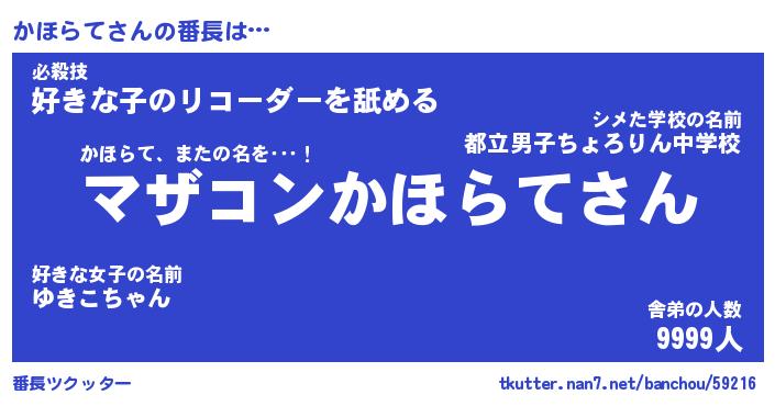 | 意味不明あだ名 | 『ペロリンかほらて』『永久保存かほらて』 |