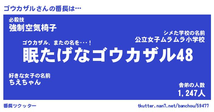 | ヒーロー風カッコイイあだ名 | 『スーパーゴウカザル』『銀牙騎士ゴウ』 |