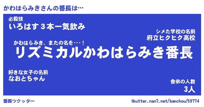 | ヘコむあだ名 | 『かわにー』『なまこ酢』『かわ太郎』 |