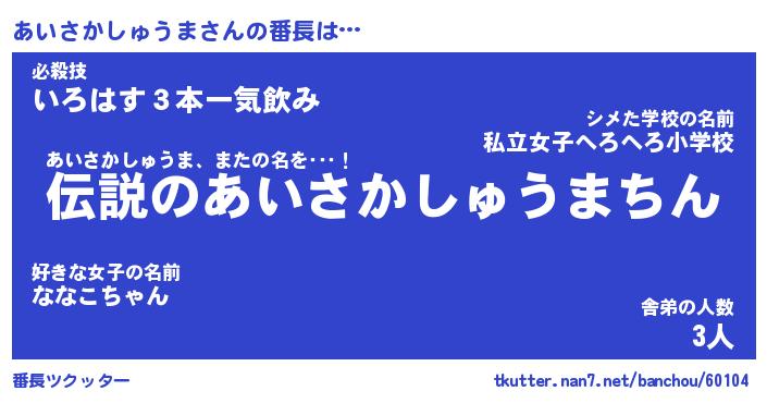 | 伝説のあだ名 | 『伝説のスナイパーあいさかしゅうま』 |