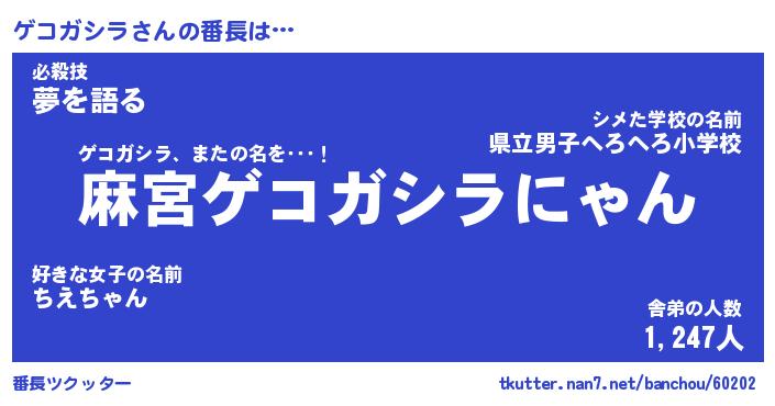 | ヒーロー風カッコイイあだ名 | 『スーパーゲコガシラ』『銀牙騎士ゲコ』 |