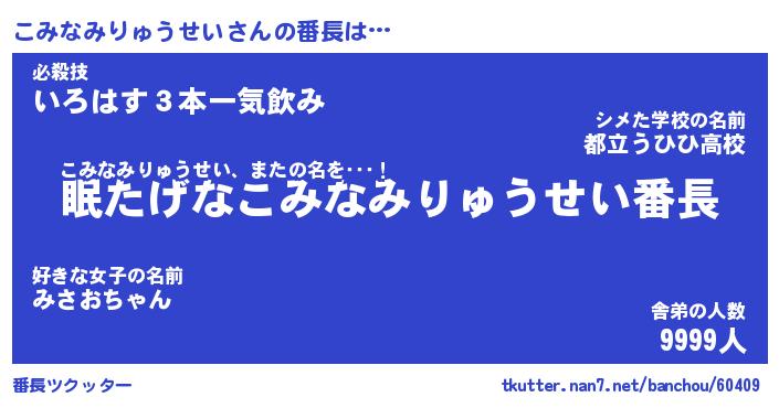 | 伝説のあだ名 | 『封印されしスナイパーこみなみりゅうせい』 |