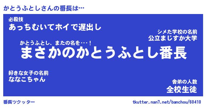| ヒーロー風カッコイイあだ名 | 『スーパーカトウフトシ』『暗黒騎士カト』 |