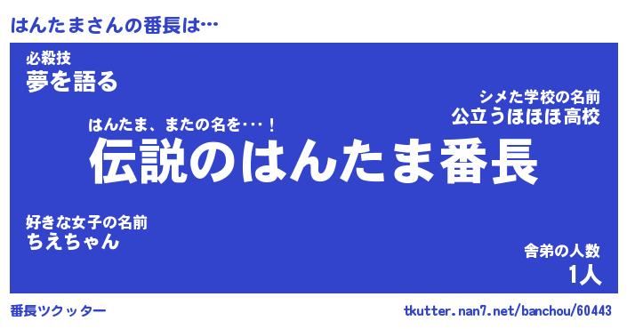 | ポケモン風あだ名 | 『ハンチュウ』『ハンタダネ』 |