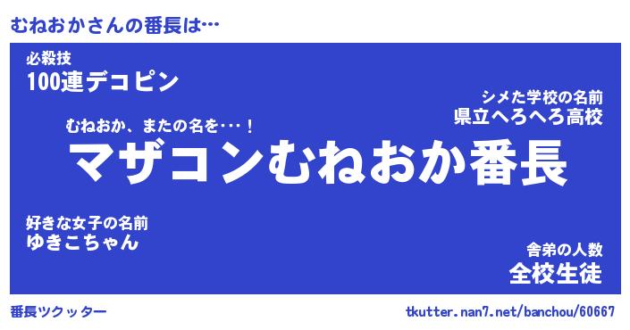 | 肩書あだ名 | 『むねおか店長』『むねおか総理大臣』 |