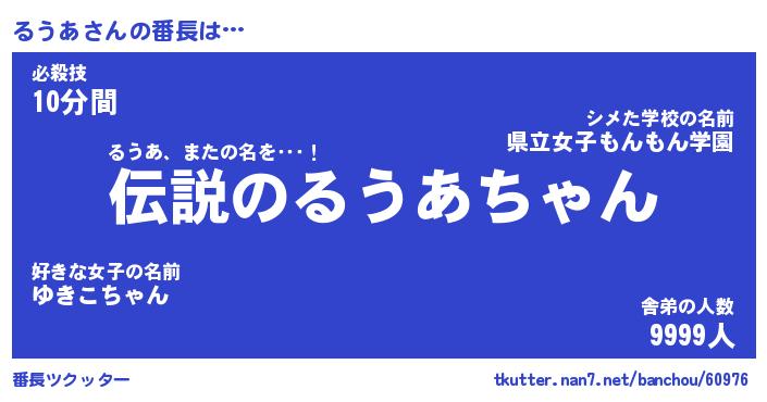 | 伝説のあだ名 | 『伝説のスナイパーるうあ』 |