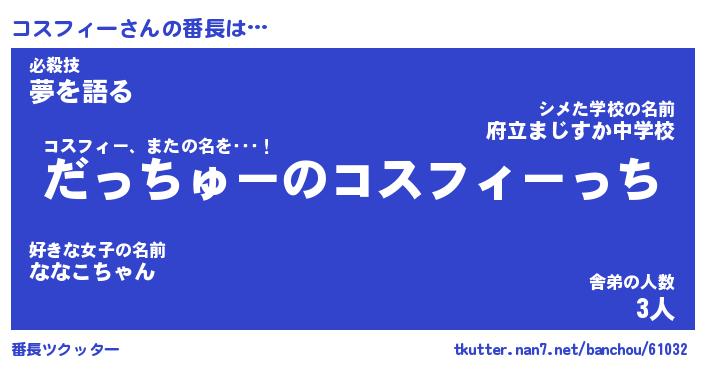 | 男性向けラノベタイトル風あだ名 | 『コスフィーの憂鬱』 |