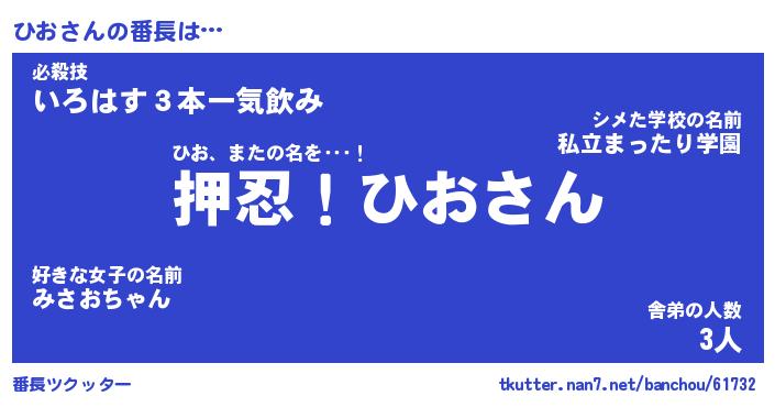 | ヘコむあだ名 | 『ひおにゅー』『なまこ酢』『ひおお』 |
