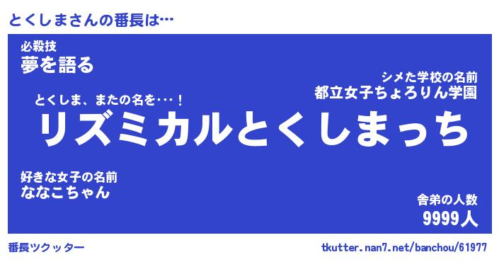 | ヒーロー風カッコイイあだ名 | 『スーパートクシマ』『天弓騎士トク』 |